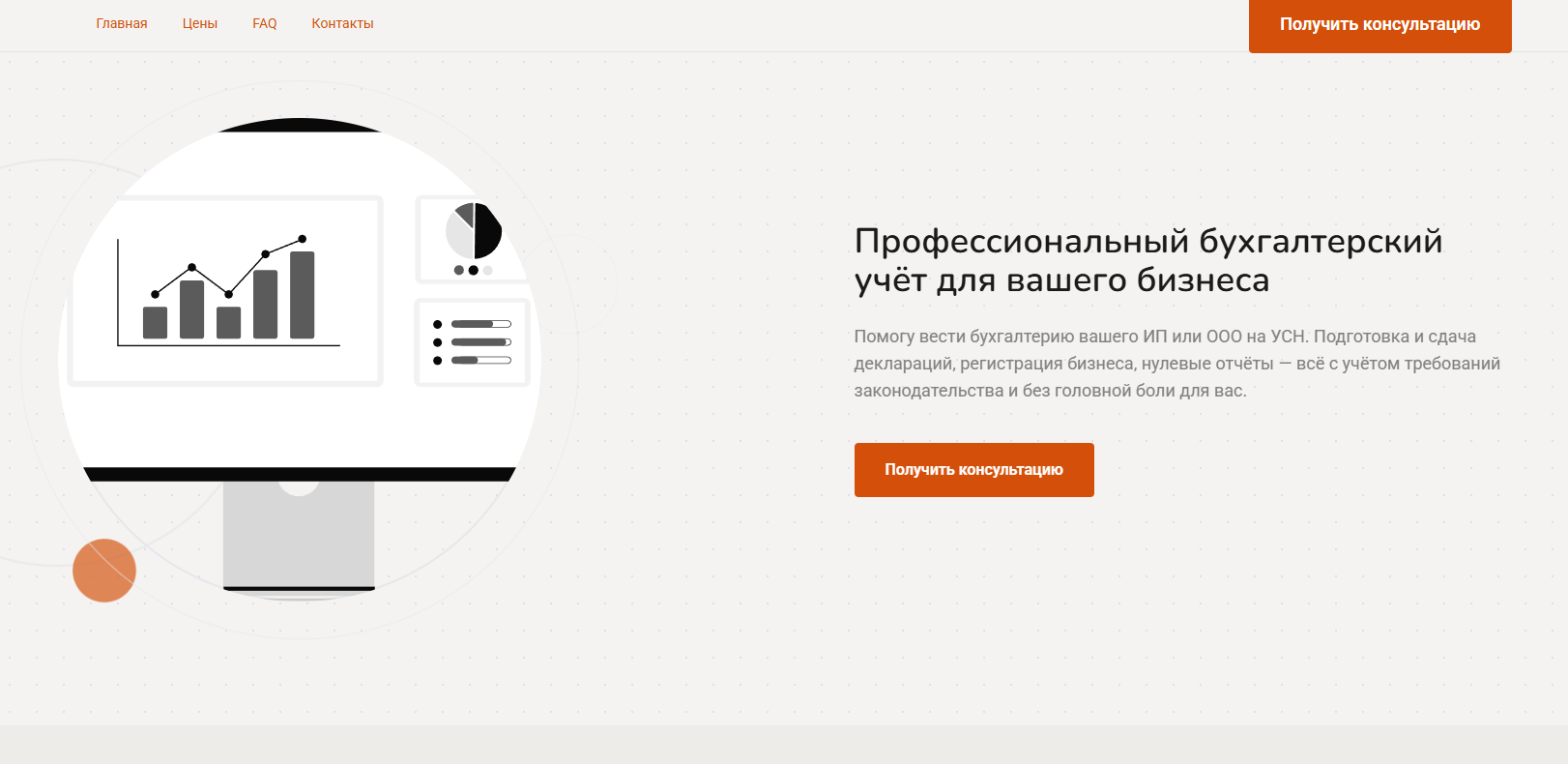 Лендинг разместили на домене и запустили рекламу под запросы "бухгалтер для ИП на аутсорсе" и "бухгалтерское обслуживание малого бизнеса". Страница сразу давала нужное впечатление: специализация понятна, цены указаны, форма заявки на видном месте.