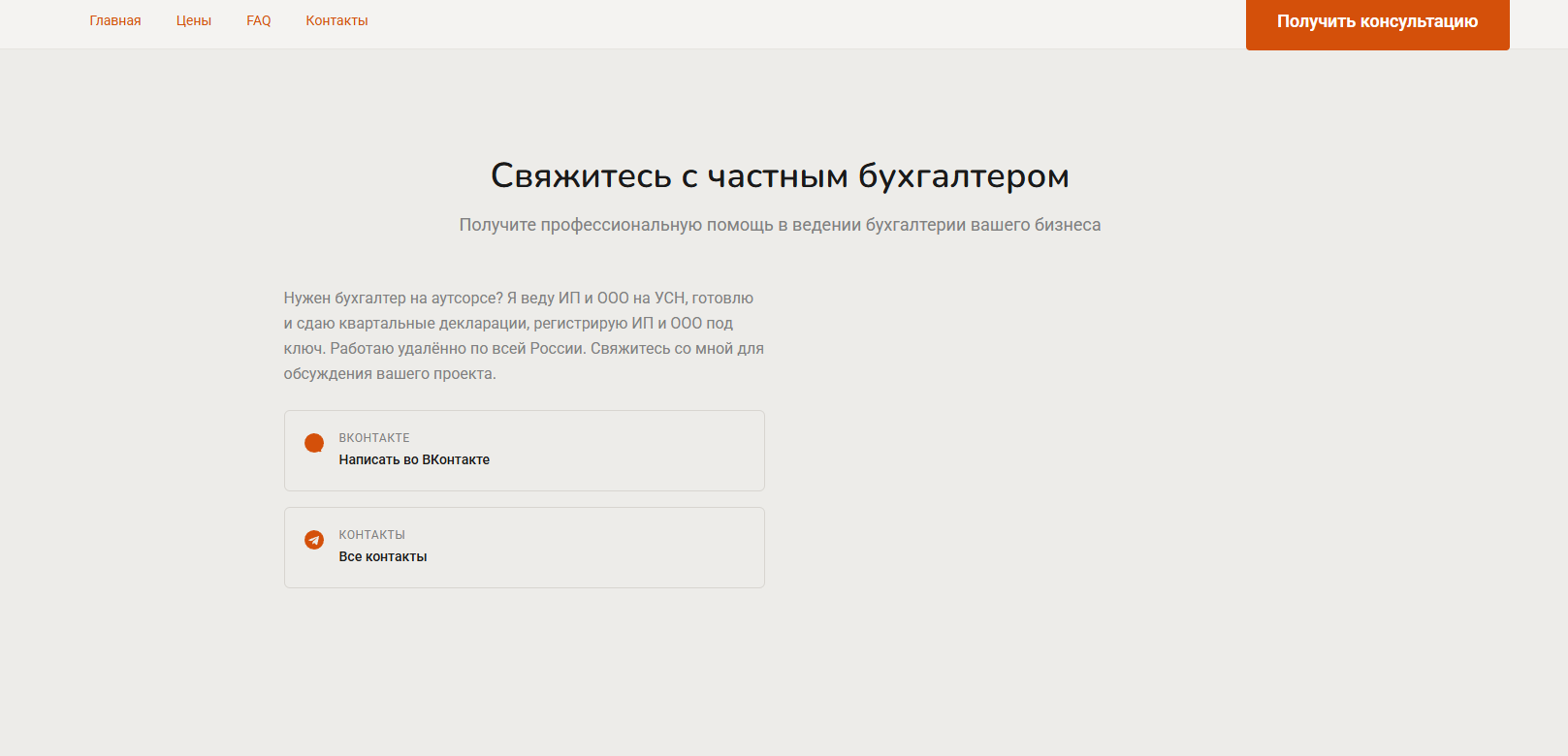 Лендинг решил не просто задачу "нет сайта". Он изменил позиционирование: теперь это не фрилансер который ищет заказы, а специалист с профессиональной страницей к которому обращаются сами. Следующий шаг — отдельная страница под ведение ООО на ОСНО.