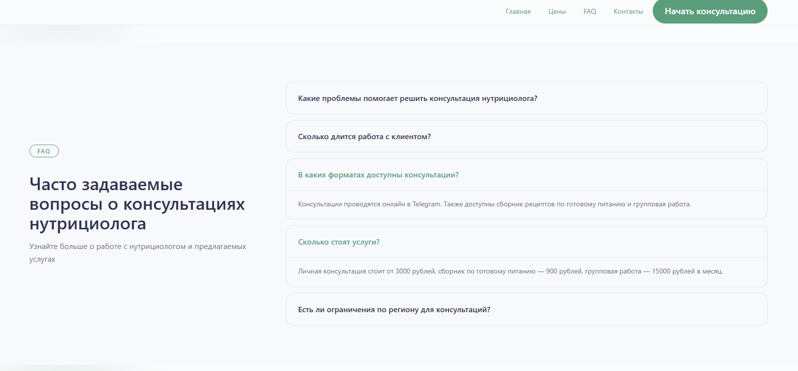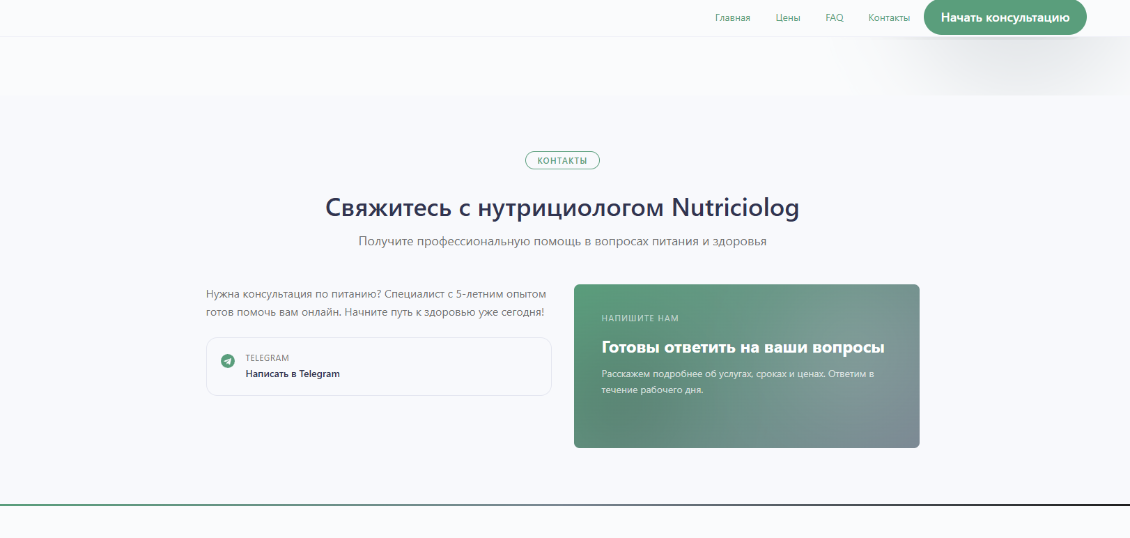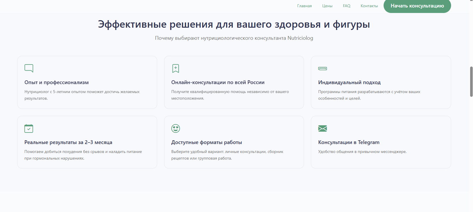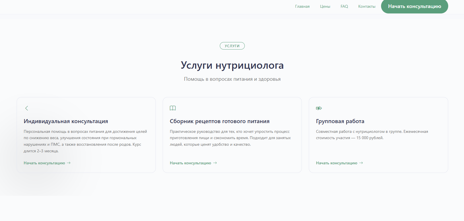 Через несколько недель лендинг начал индексироваться в Яндексе по запросам «нутрициолог при ПМС» и «питание при гормональных нарушениях онлайн» — появились бесплатные заявки из поиска от именно тех клиентов, которых она искала: мотивированных и готовых работать над результатом.