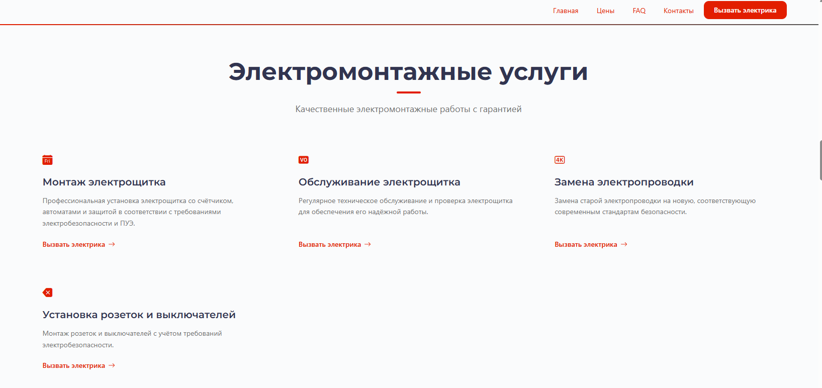 Частный электрик с многолетним опытом. Занимается монтажом электропроводки, установкой розеток и выключателей, подключением электрощитов, заменой счётчиков и устранением неисправностей. Клиентов находил через знакомых и объявления, своего сайта не было.