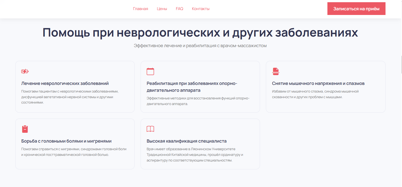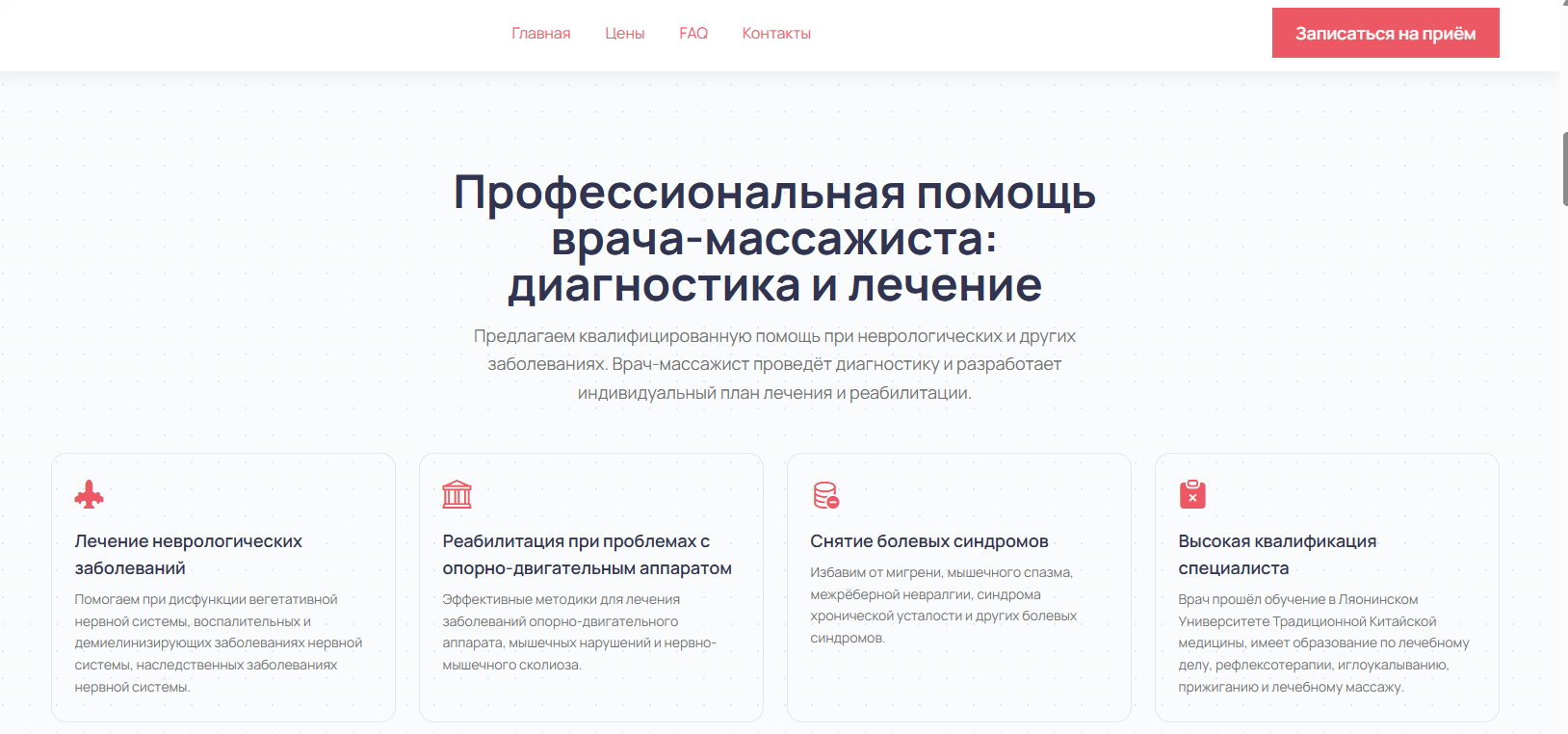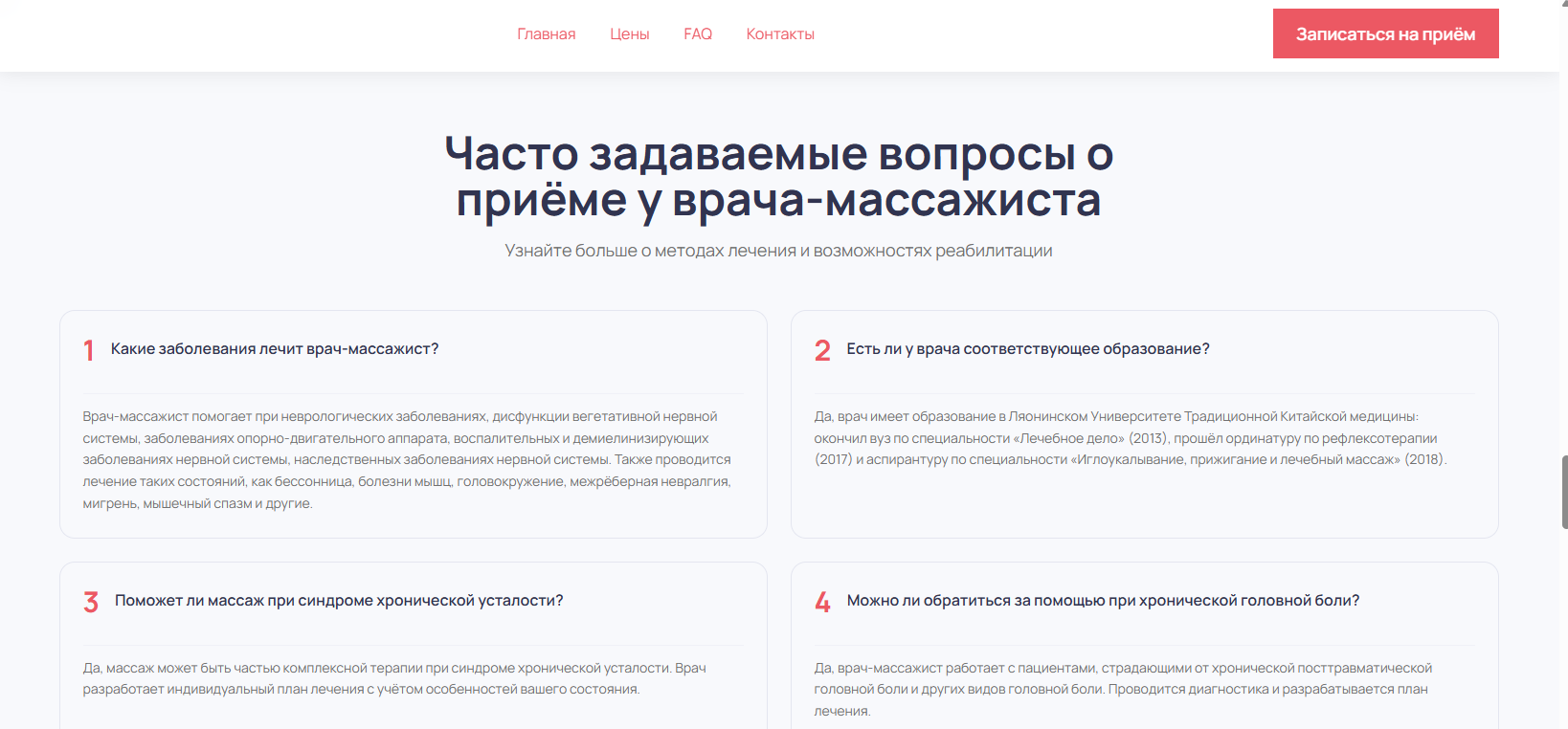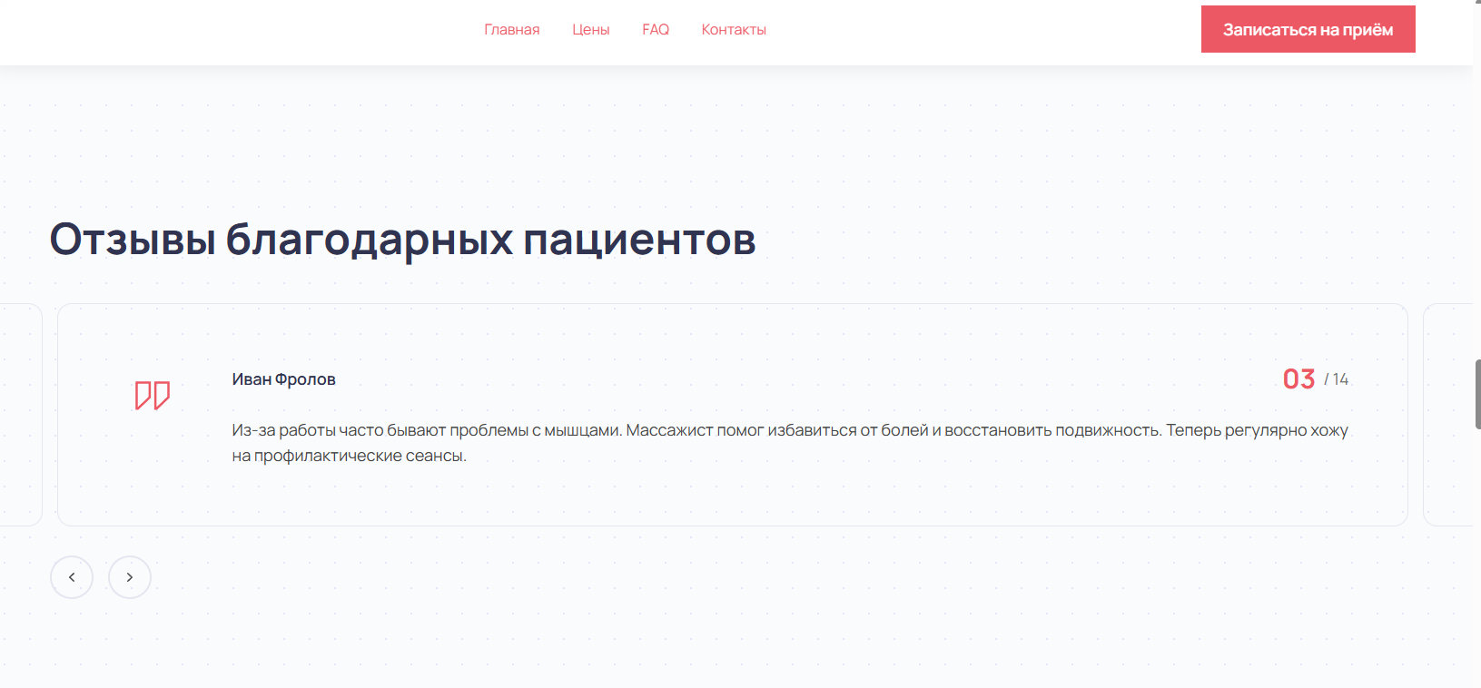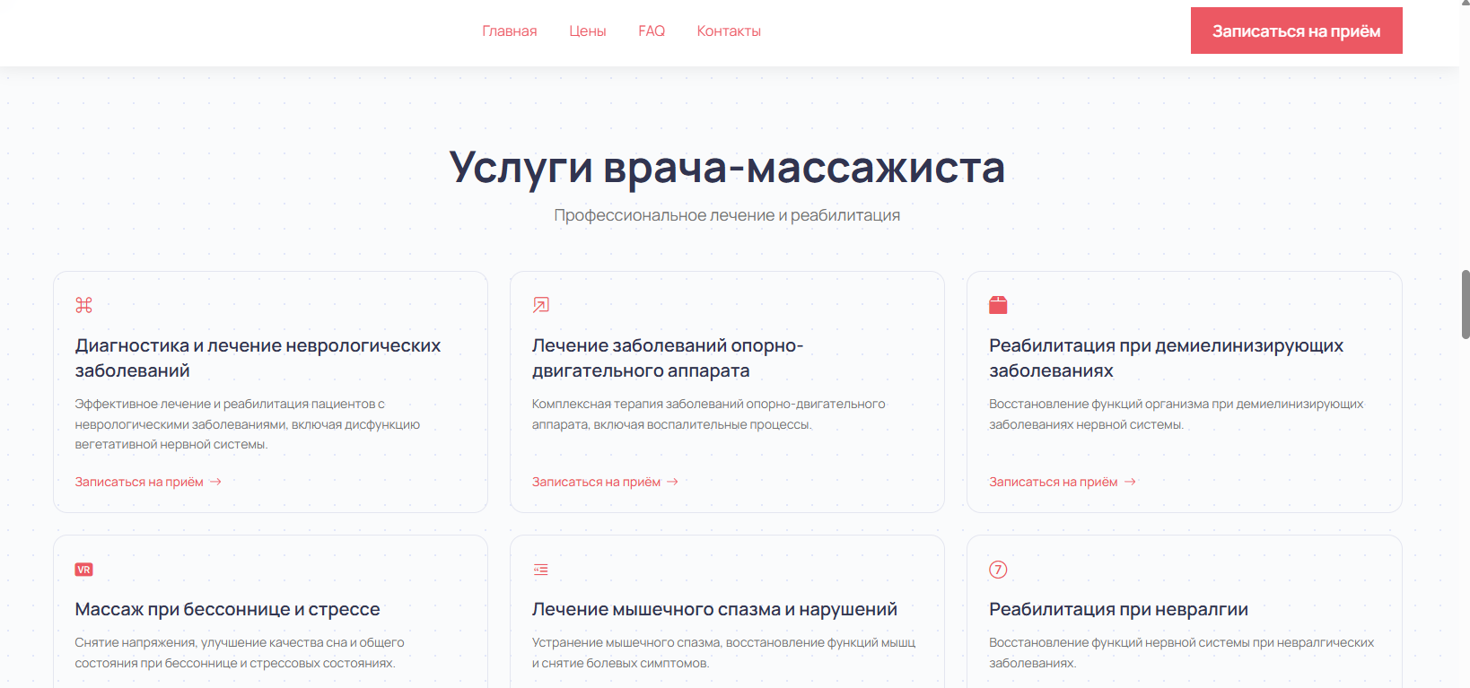 Лендинг начал индексироваться в Яндексе по запросам «лечебный массаж» и «массажист на дому», появились бесплатные заявки из поиска без рекламного бюджета. Расписание заполнилось на 2–3 недели вперёд.